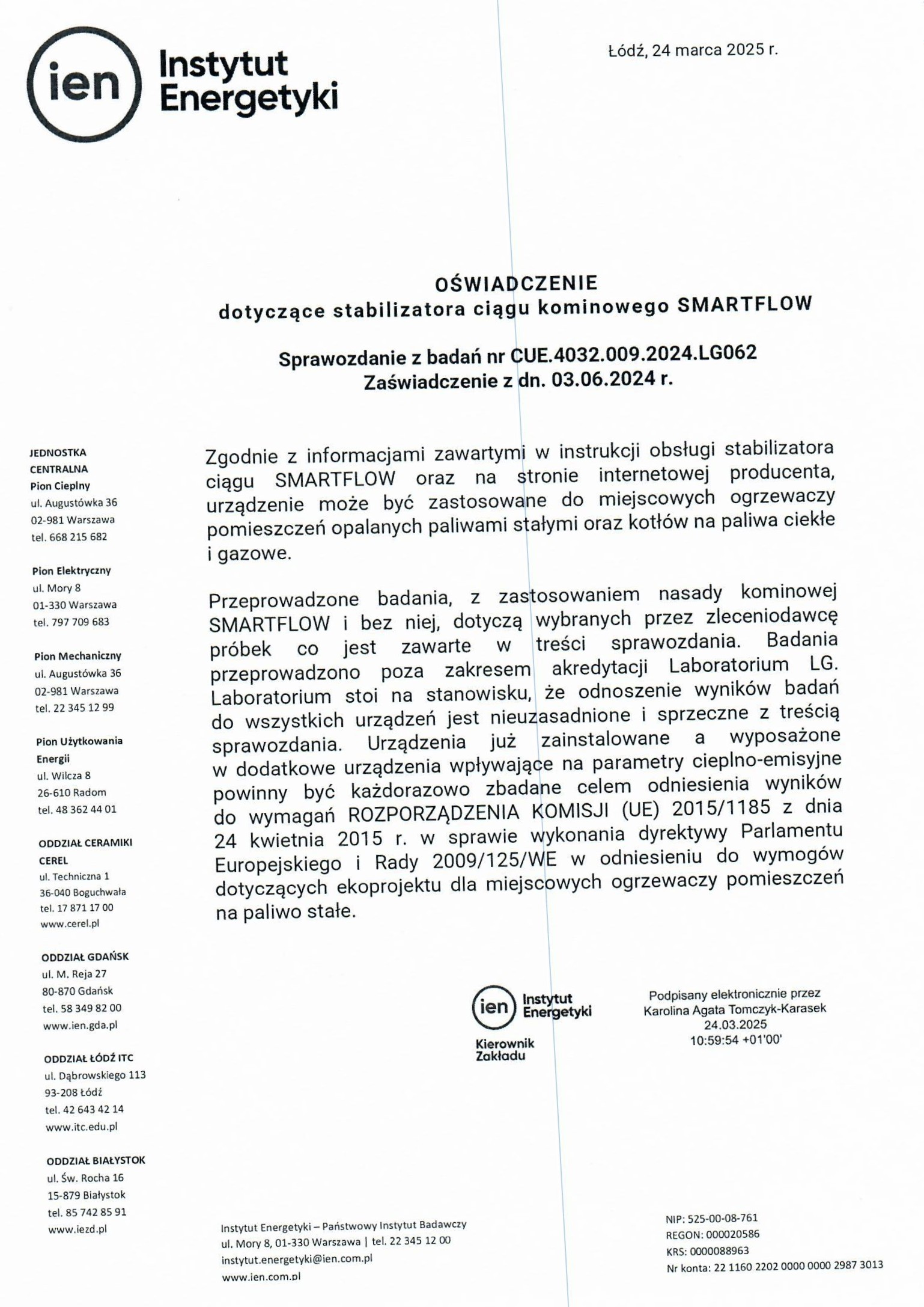 Oferowane na rynku urządzenie nie jest uniwersalne. Zaświadczenie dotyczy badania wyłącznie urządzenia podłączonego do konkretnego wkładu kominkowego. Instytut Energetyki - Państwowy Instytut Badawczy, który testował oferowane na rynku urządzenie zamieścił na swojej stronie internetowej oświadczenie, którego skan zamieszczamy TUTAJ.